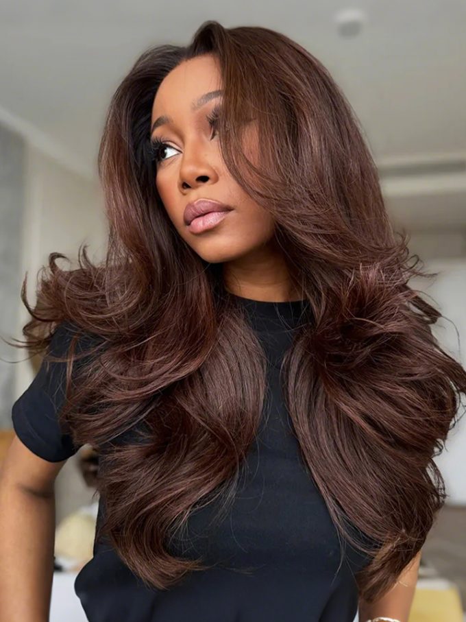 Butterfly Layered Cut Loose Wave Dark Brown / Burgundy Color Pull Go Glueless 6×5 Lace Wig 250%
